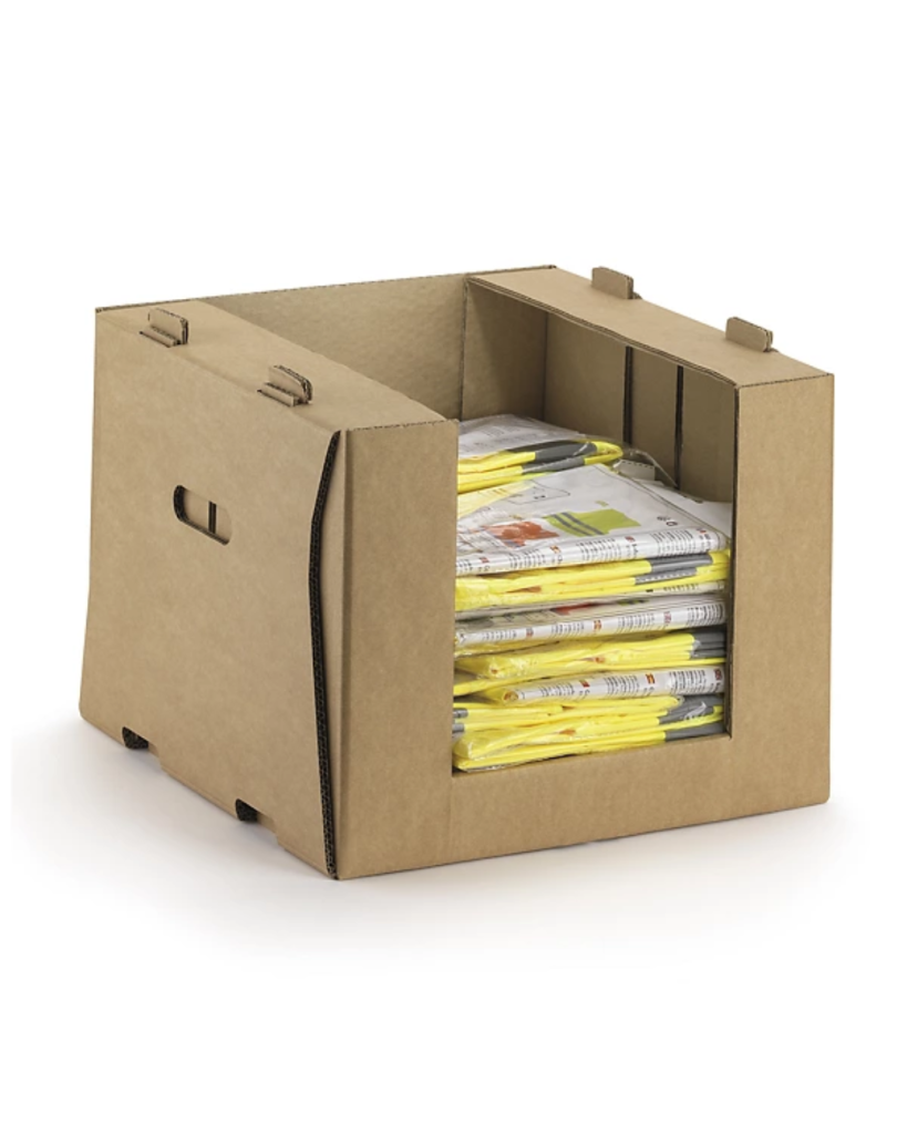 Caja de cartón para picking norma Europa Ahorra espacio con estas cajas apilables, con abertura frontal para un acceso rápido y cómodo. Ligeras y fáciles de montar, son resistentes y duraderas gracias a su cartón canal doble 84% reciclado. Compatibles con palets de formato europeo, optimizan tu logística.